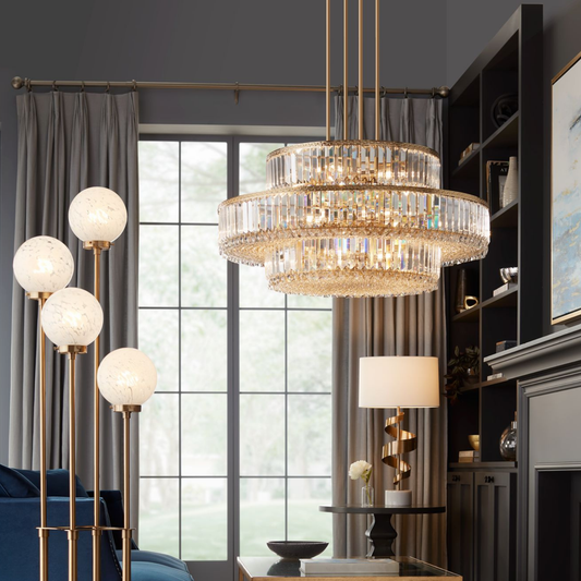 Chandelier / Lámpara Colgante De Tres Niveles Color Oro Suave & Cristal
