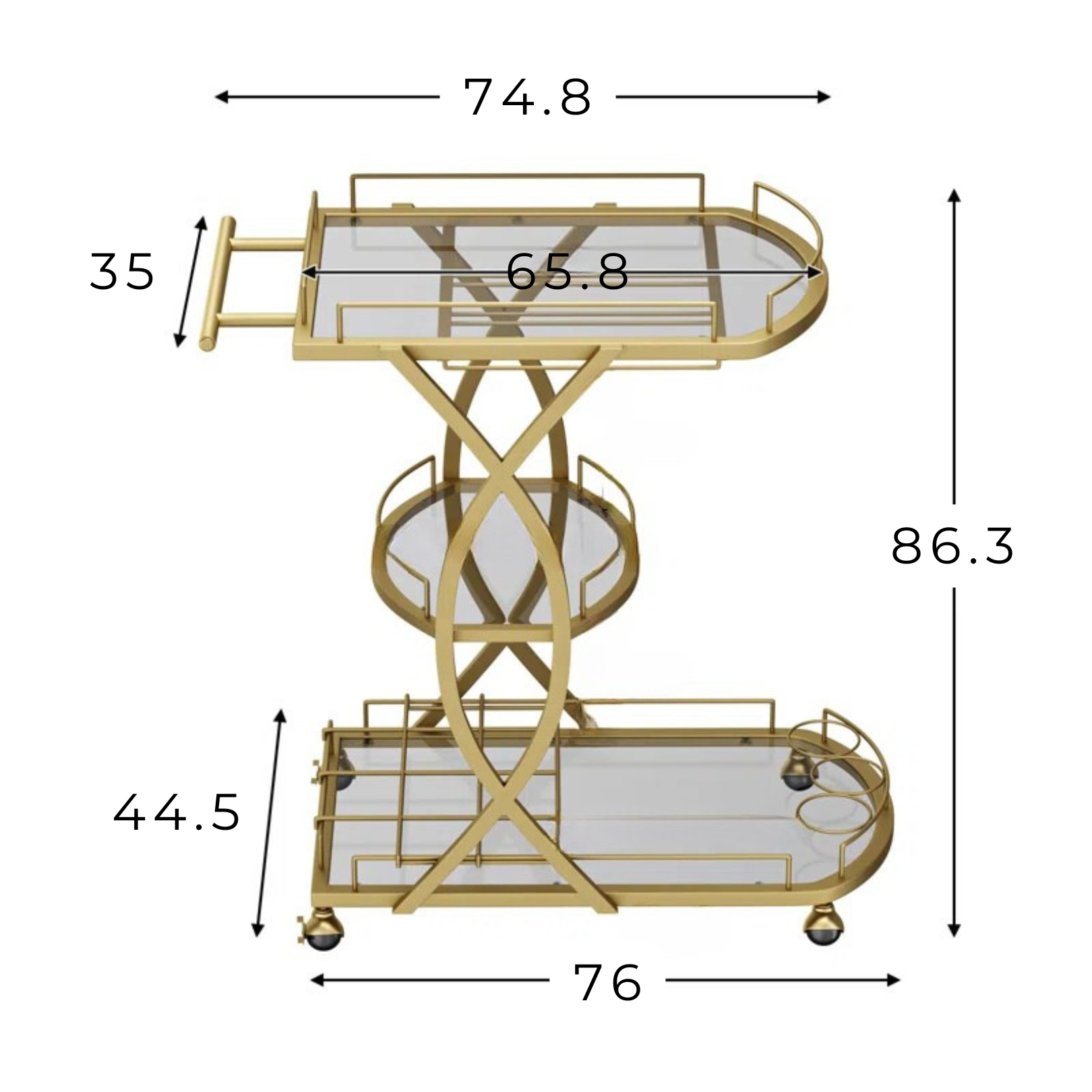 - Estructura en acero dorado con estantes de vidrio templado.